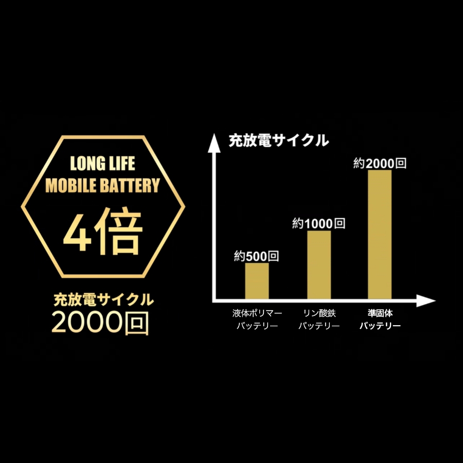★長寿命:2000回の充放電サイクル(容量80%)を実現。